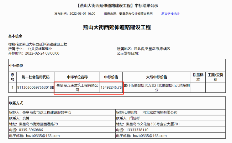 ※ 2月24日,燕山大街西延伸道路建设工程施工招标开标,秦皇岛万通建筑工程有限公司中标,中标价格为15492245.78元。