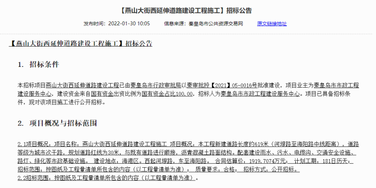 ※ 2022年01月30日,秦皇岛市市政工程建设服务中心作为招标人,针对燕山大街西延伸道路建设工程施工公开招标。