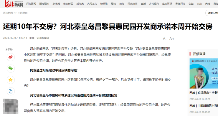 近日,网友通过阳光理政平台反映“河北秦皇岛昌黎县惠民园小区延期10年不交房”的问题。河北省秦皇岛市住房和城乡建设局通过阳光理政平台做出回复表示,经昌黎县与地产公司协调,地产公司负责人答应本周内开始交房。
