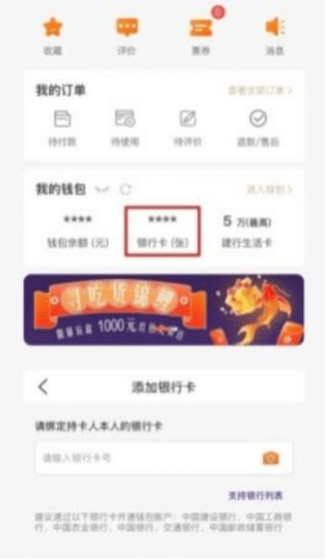 第三步,点击“我的”再点击“银行卡”,进行银行卡绑定。建议通过以下银行卡进行绑定:中国建设银行、中国工商银行、中国农业银行、交通银行、中国邮政储蓄银行等(详见添加银行卡页面支持银行列表)。