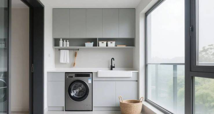 更宽更阔的阳台空间,在功能上可以满足洗衣、晾晒、储物的需求。洗衣机、干衣机叠放于室内,储物功能区还可以维持生活空间的整洁有序。