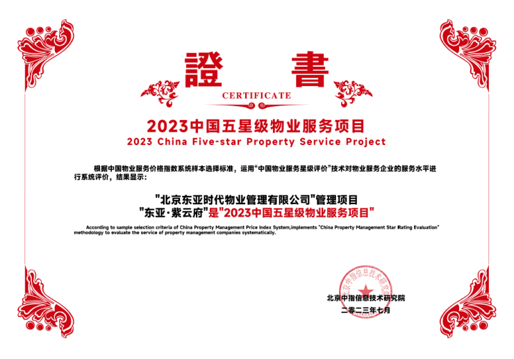 物业水平的高低会直接影响到业主入住后的日常体验,东亚紫云府不仅买的放心,住的还顺心,它的物业是东亚集团自持物业——东亚时代物业,曾多次荣获行业内外好评,最近东亚紫云府项目更是被评为“2023中国五星级物业服务项目”称号,再次展现了东亚时代物业市场实力和地位。