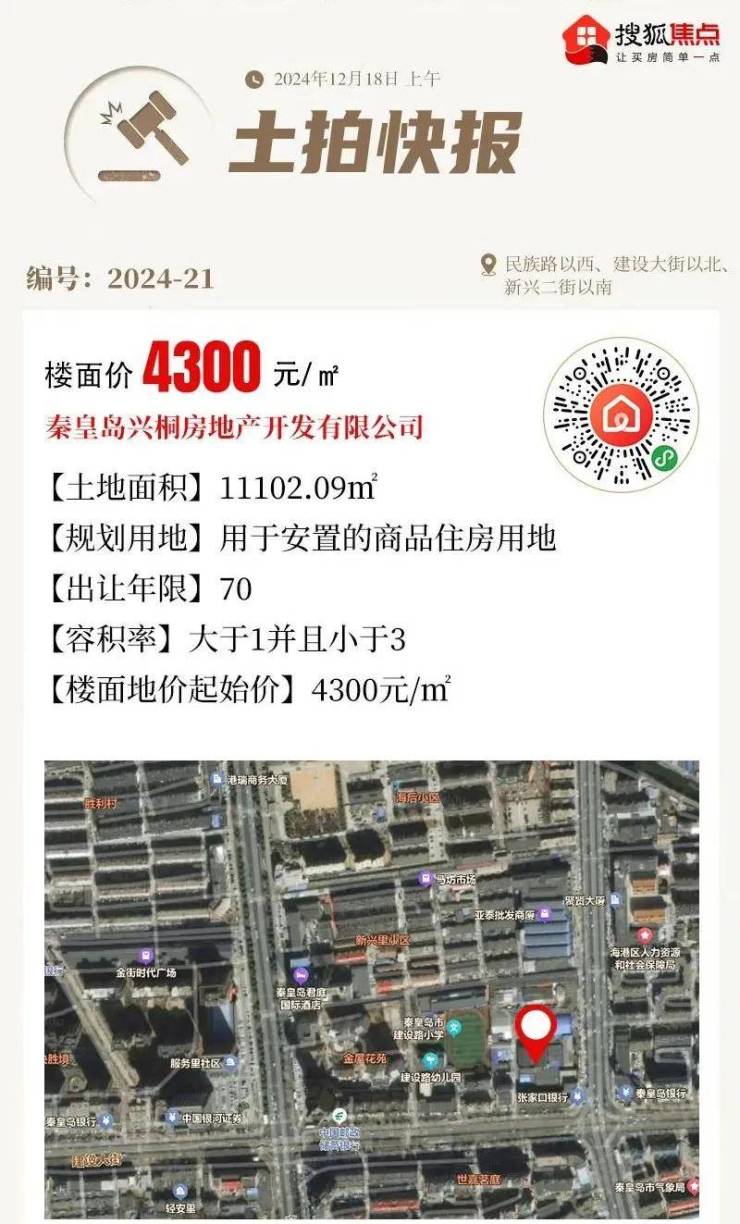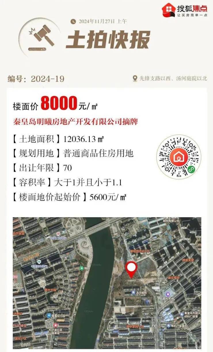 土拍回顾:该地块是明曦地产于2024年11月摘牌的商品住房用地,成交总价约1.06亿元,成交楼面价8000元/㎡,刷新了秦皇岛土拍市场近年来的楼面单价新高。