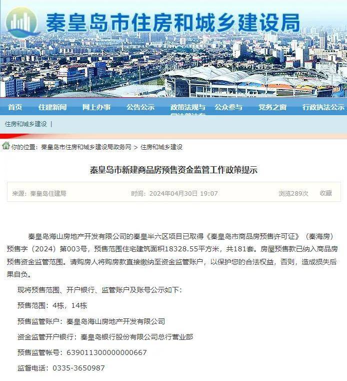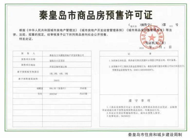 预售监管账户:秦皇岛海山房地产开发有限公司