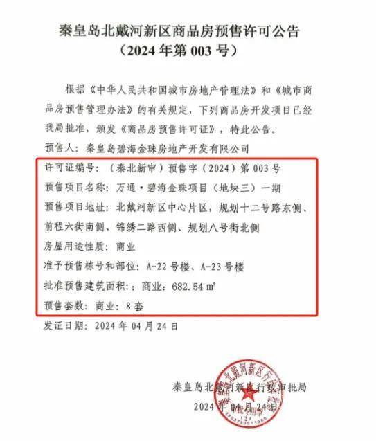 据住建局官网显示,秦皇岛2024年4-5月共计发出7张商品房预售证,涉及玺悦台、绿城·悦园、秦皇半岛·六区及阿那亚、万通·碧海金珠五个项目。共计424套住宅入市,预售住宅建筑面积共48506.05㎡。