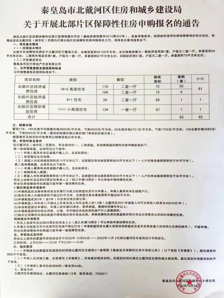 秦皇岛市北戴河区住房和城乡建设局关于开展北部片区保障性住房申购报名的通告