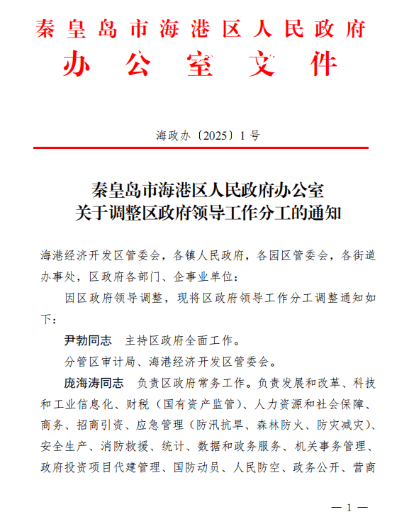 海港经济开发区管委会,各镇人民政府,各园区管委会,各街道办事处,区政府各部门、企事业单位:因区政府领导调整,现将区政府领导工作分工调整通知如下: